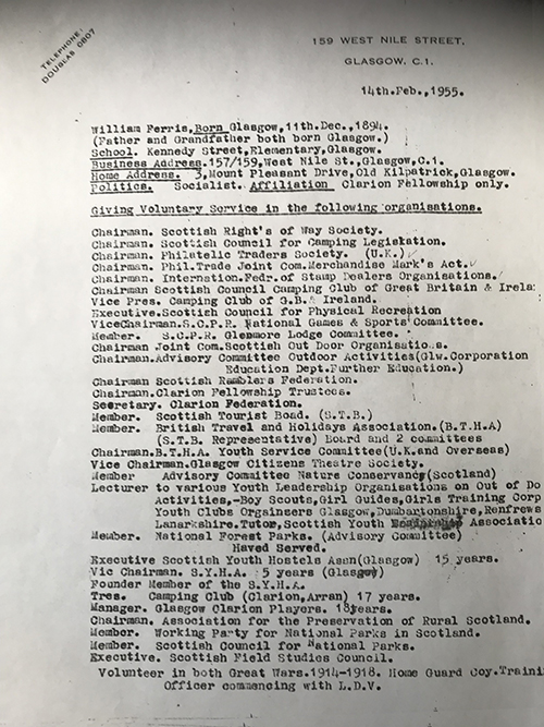 As an Executive member of the SCPR dad was Vice Chairman of the National Games and Sports Committee, Member of the Glenmore Lodge Committee, Chairman of the Joint Committee of Scottish Outdoor Organisations, Chairman of the Advisory Committee of Outdoor Activities (Glasgow Corporation Further Education Dept)